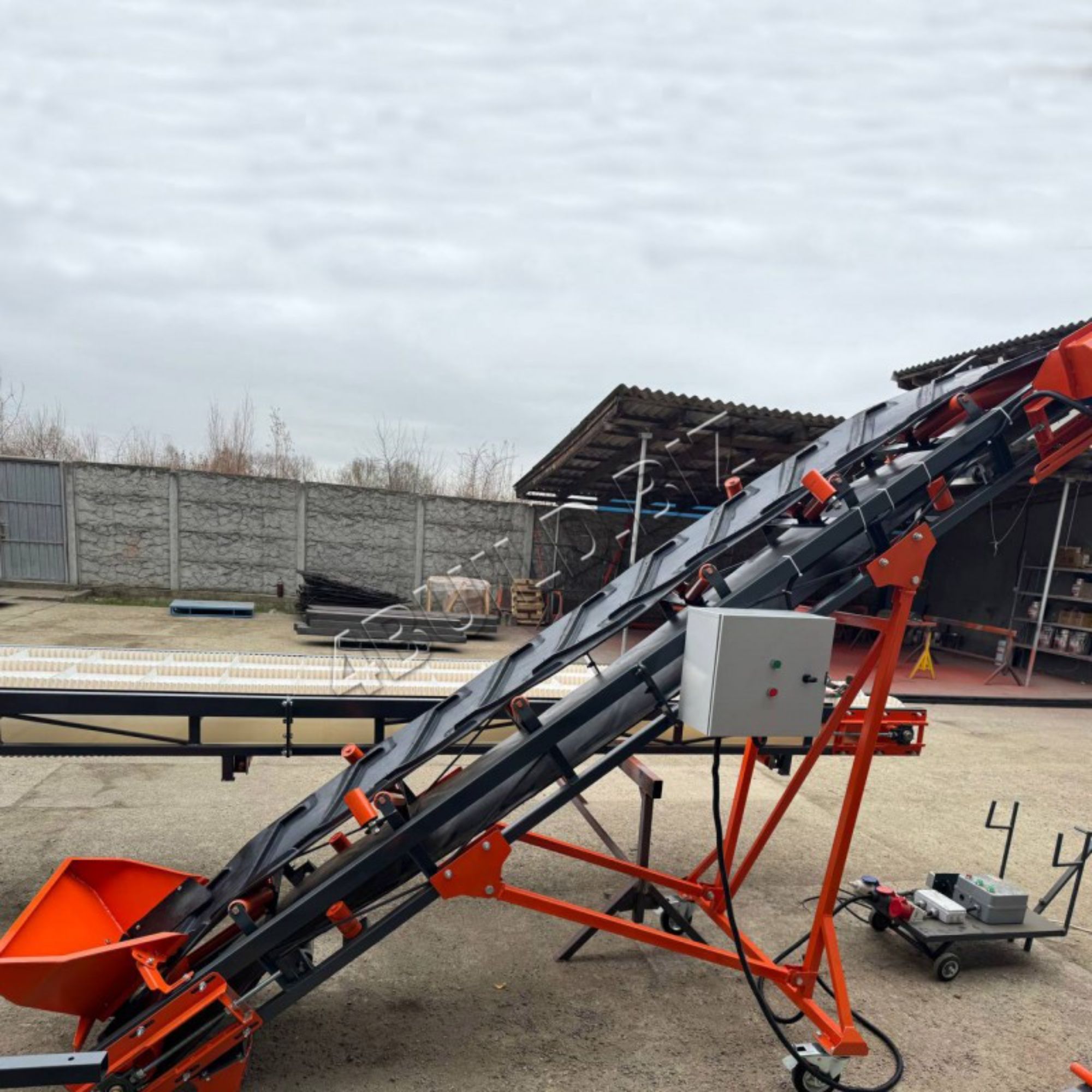 Transportorul înclinat este destinat alimentării materialelor sub un unghi, cu posibilitatea reglării înălțimii. Echipamentul este utilizat pentru alimentarea buncărelor, silozurilor și liniilor tehnologice. Structura mobilă pe roți asigură o deplasare ușoară în incintă, iar dispozitivul de tractare permite cuplarea la vehicule.